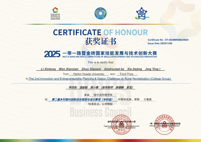 学生在跨学科实践中综合能力显著提升。 在全国高校商业精英挑战赛创新创业竞赛创业计划赛道全国总决赛中荣获全国二等奖;在全国高校商业精英挑战赛会展专业创新创业实践赛数字新媒体(短视频)全国总决赛中荣获全国二等奖;在一带一路暨金砖国家技能发展与技术创新大赛智慧文旅赛项中,凭借《候鸟 E 站・宠旅相伴》项目荣获全国三等奖;在第二届乡村振兴创新创业规划与设计竞赛中,两支跨学科团队分别斩获三等奖与优秀奖,展现了“语言 + 文旅 + 技术 + 营销 的跨学科应用能力。