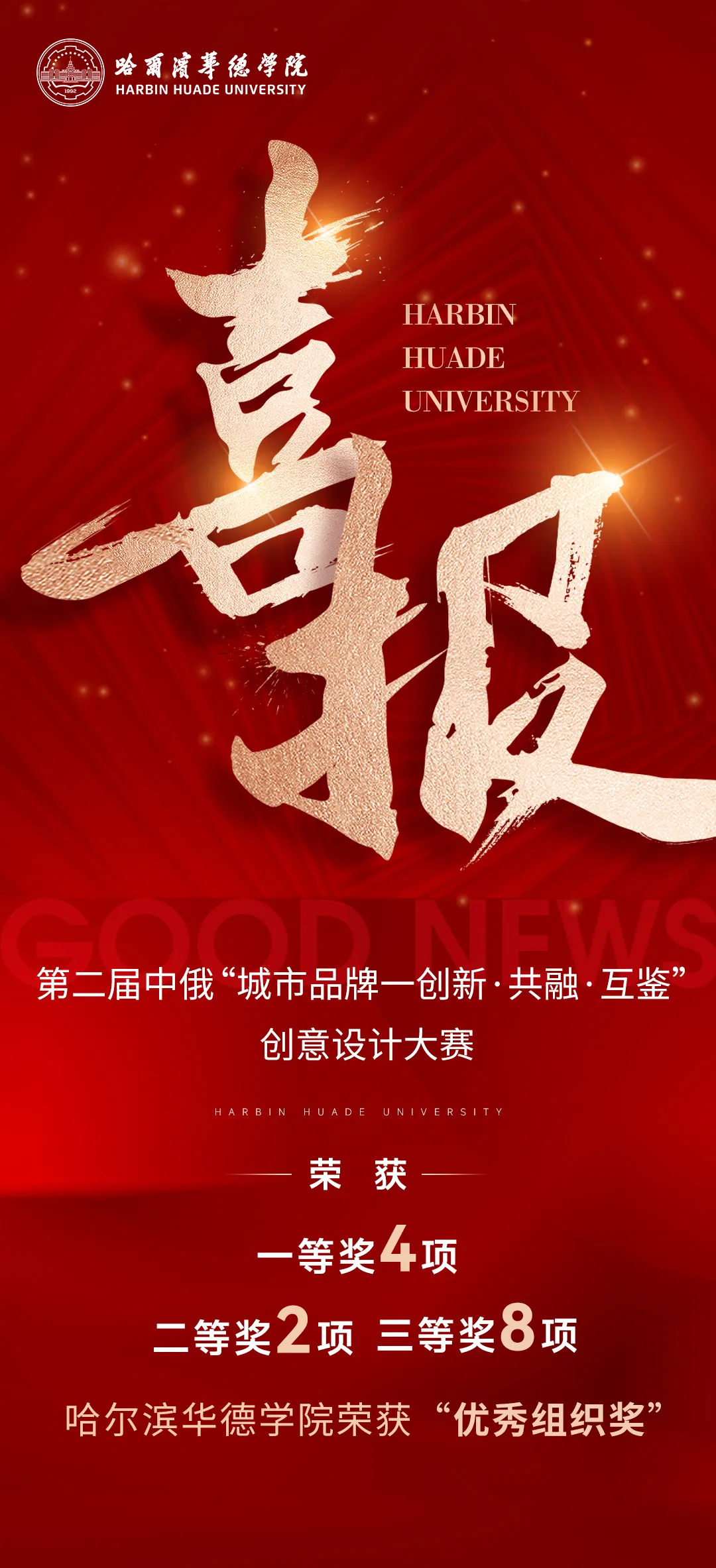 近日,第二届中俄“城市品牌一创新·共融·互鉴”创意设计大赛圆满落幕。哈尔滨华德学院艺术与传媒学院师生凭借扎实的专业功底与出色的创意表现,从41所参赛院校、1721份作品中脱颖而出,共斩获 一等奖4项、二等奖2项、三等奖8项 ,三位教师获 “ 优秀 指导教师” 荣誉称号 , 哈 尔滨华德学院荣获 “优秀组织奖” 。这份成绩单不仅是对师生专业能力的肯定,更是艺术与传媒学院长期坚持“教赛结合、以赛促学”教学理念的生动体现。